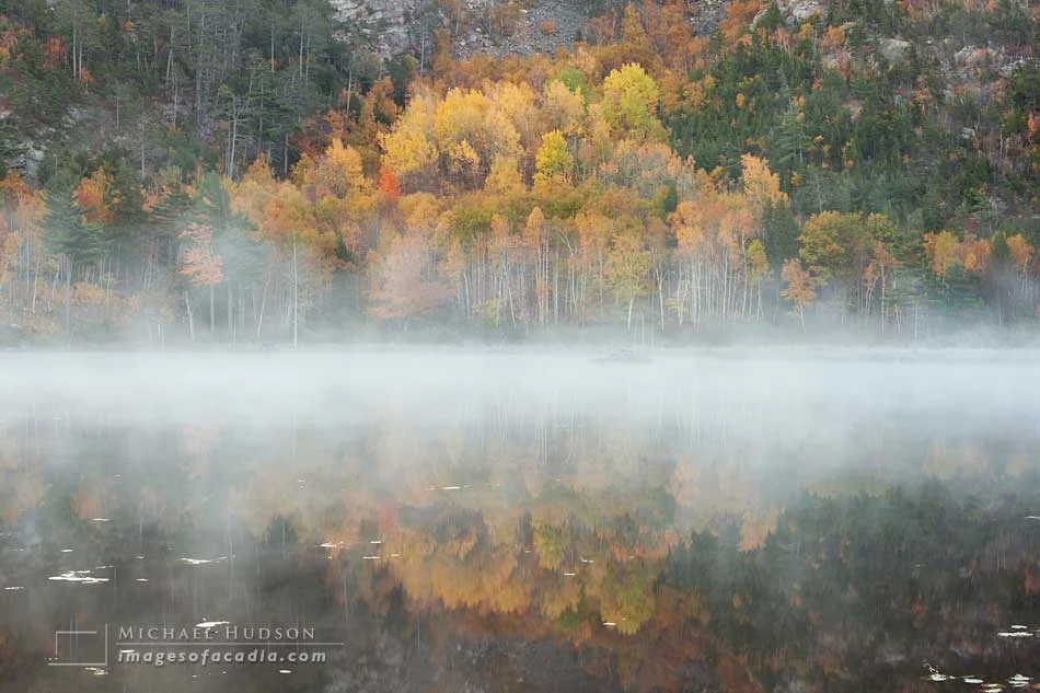On the day I made this image in 2008, I had spent the first hour of the day at Otter Cliff photographing the early morning light. Away from the coast, the air was very still and quiet, so I made my way to Beaver Dam Pond to see what I'd find. Fortunately, it was one of those rare mornings where there was a mist hanging over the water. As the air warmed, the mist began to move and grow. It didn't last more than a few minutes, but I was able to make several images, including a long panoramic image before it evaporated.