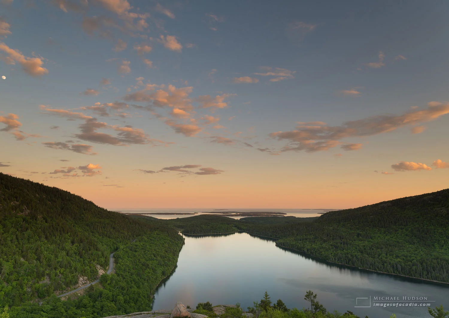 Last October, I climbed South Bubble Mountain overlooking Jordan Pond, to photograph the sunrise to the south. This summer, I returned to photograph the sun going down from the same vantage point. Jordan Pond and Bubble Mountain are very popular spots,particularly in summer. But by going up the mountain at 7:30, I had the view, one of Acadia's finest, all to myself. If you've never climbed Bubble Mountain, it's a relatively easy hike, about 20-30 minutes from the small parking lot along Park Loop Road. Pass the Balance Rock on your left, and head to the front (south) of the mountain for this scenic viewpoint. Then cross your fingers and hope for a good sunset/ sunrise. Either way, enjoy the view.