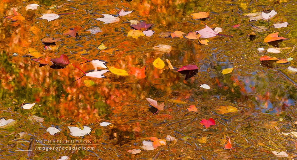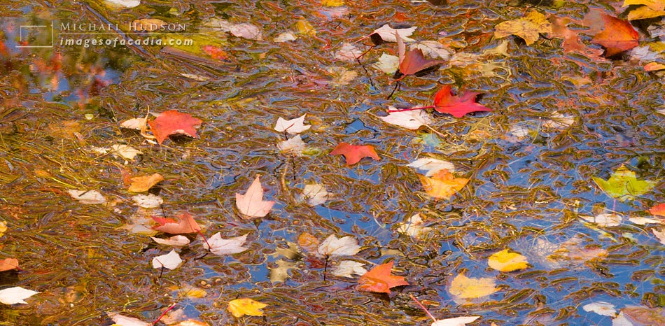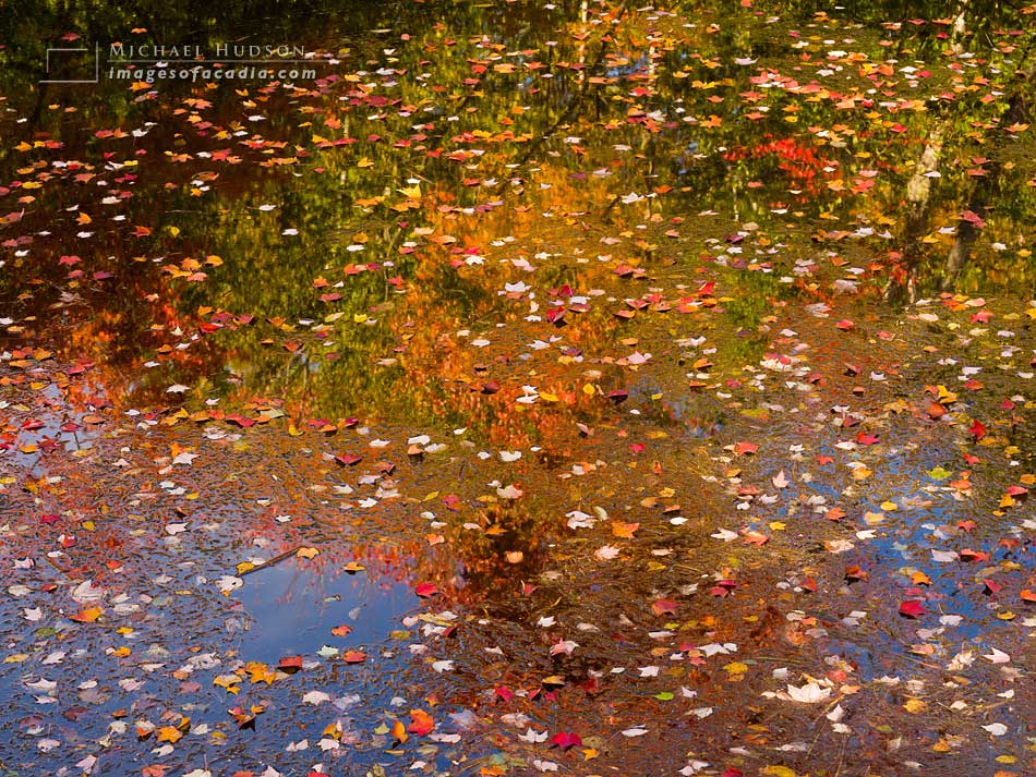 The weather really dictates where I go and what I'll look for. On this day, the sky was a brilliant blue– perfect for most people, but too 'postcard-y' for me. But you work with what you've been given. I knew that with the blue skies, it would be a good day for photographing colorful foliage, specially if I could mix the yellows, reds and oranges with the blues. But rather than photograph foliage on trees, I went looking for fallen leaves on water to add a different dimension to the image, with the leaves all suspended face up or down and the blue sky reflected in the water.