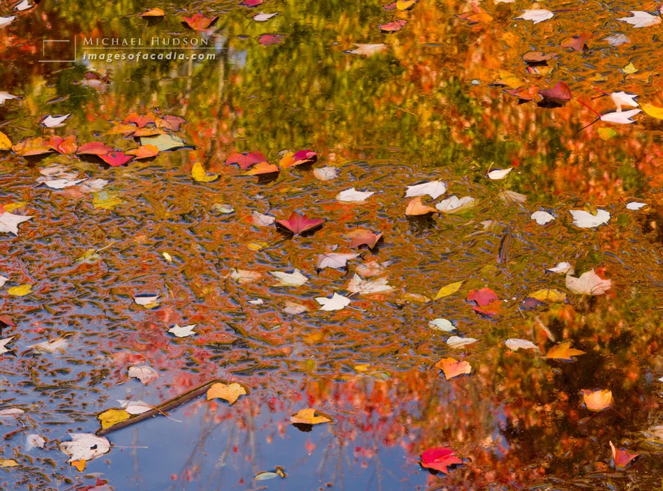 And it couldn't just be any body of water- it had to be somewhere calm enough to get good reflections under the leaves, so I searched for a pond with colorful trees on the opposite bank to reflect back into the water, adding a second layer of abstract color below the fallen leaves. I also had to find leaves that had just fallen, so I wouldn't get a lot of dead, brown leaves in the image. It was a tall order but I managed to find the perfect location on the quiet side of the island.
