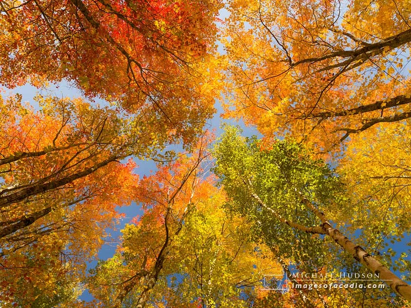 Here, about 150 feet off the Jesup Path boardwalk, I found this grove of trees breaking out in all shades of color. When I find the right spot, I spend a long time making images, sometimes several hours. My neck was sore from looking up so much. But when I was done, I think I had some of the best, most colorful images possible in Acadia.