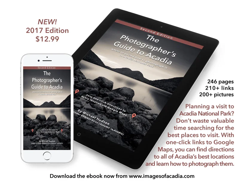 I've been spending all my free time over the last couple months updating my 2014 ebook, The Photographer's Guide to Acadia. This new version adds almost 50 more pages, about 40 more photos and over 50 new links to maps, directions, websites and videos. The book has been a valuable resource for photographers and other visitors to Acadia for the last three years, helping them locate some of the Park's best sites as well as some of the less well known locations, and helping them to come away with better pictures of Acadia. The ebook is available as a download from my website, www.imagesofacadia.com/acadia-photographers-guide-ebook or from the iTunes Store.