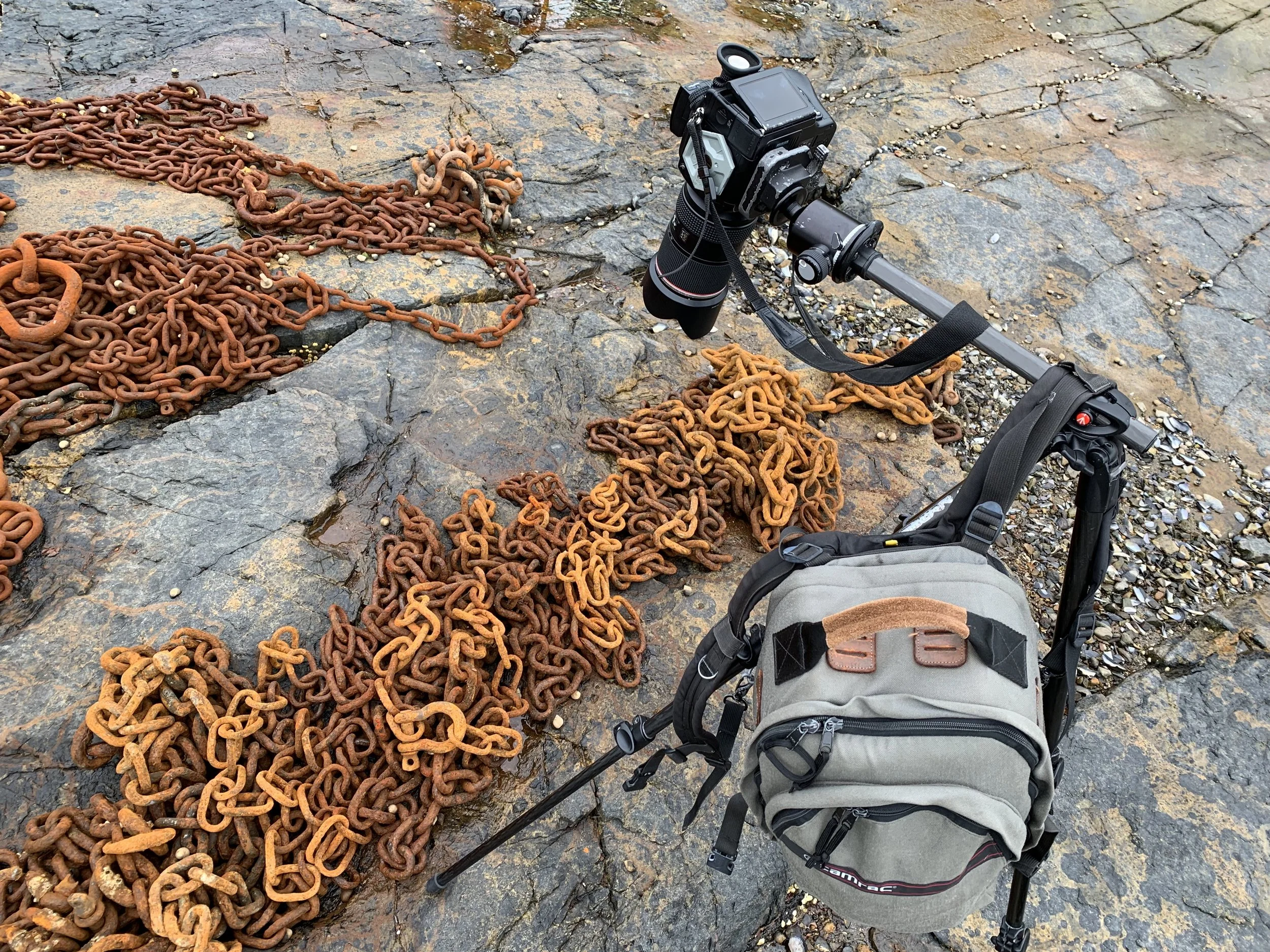 Center column extended out while photographing chains at Northeast Harbor, with camera bag as counterweight