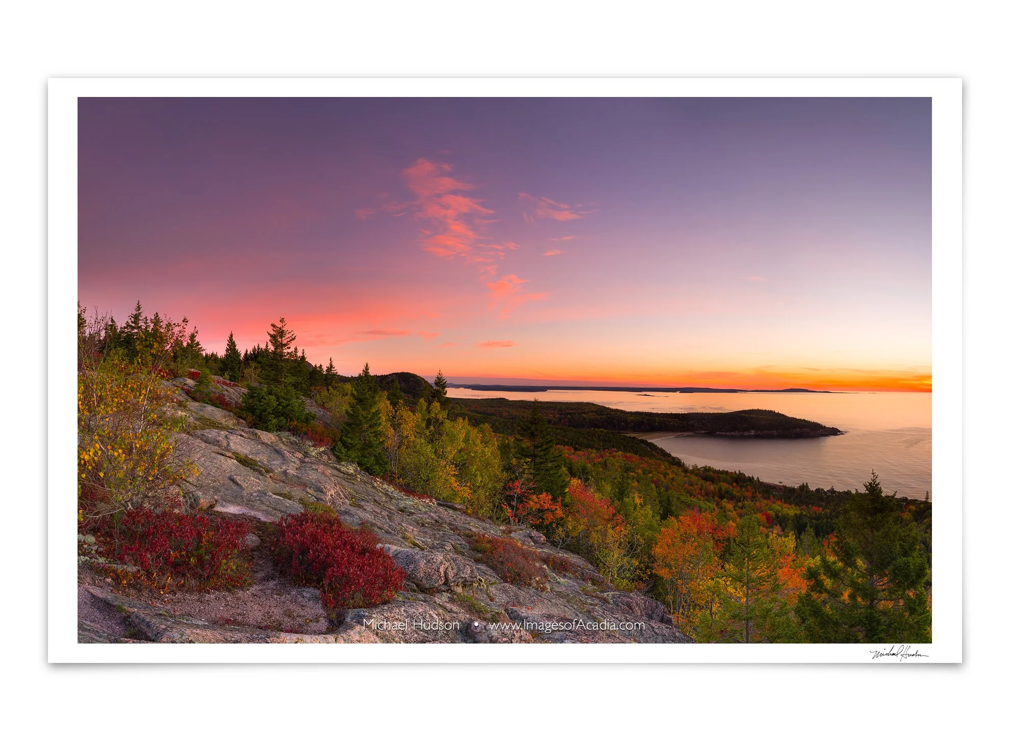 Shortly before the sun breaks above the horizon on a beautiful still morning, the sky glows with the light of dawn along the autumnal Acadia coast.