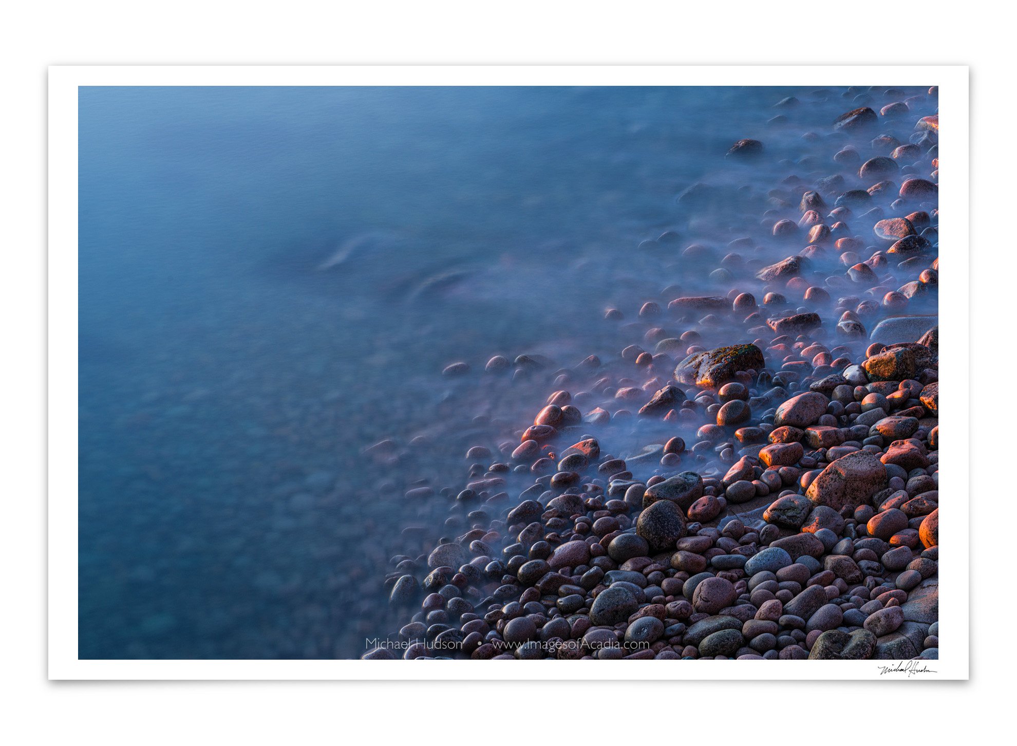 Morning sunlight kisses the boulders along the shore at Monument Cove in this long exposure image.